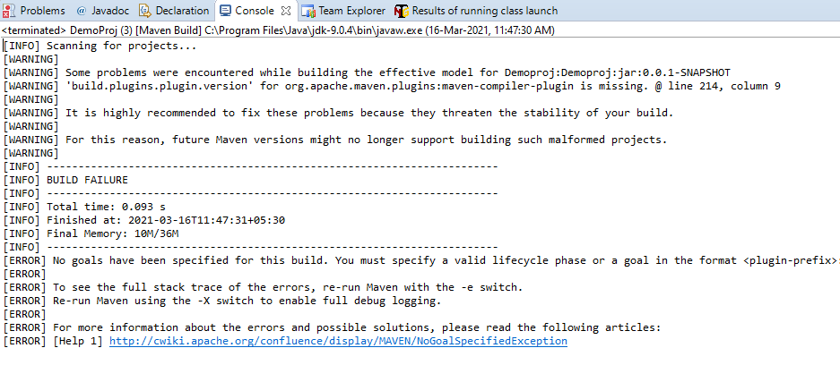 'No goal specified exception' in maven usually occurs when maven is unable to build the project through the maven build command. A Maven build has a life cycle, and each life cycle has phases. So, a life cycle phase must be specified in the 'Goal' field to resolve the No goal specified exception. A maven 'Goal' field in eclipse accepts a valid build life cycle phase.